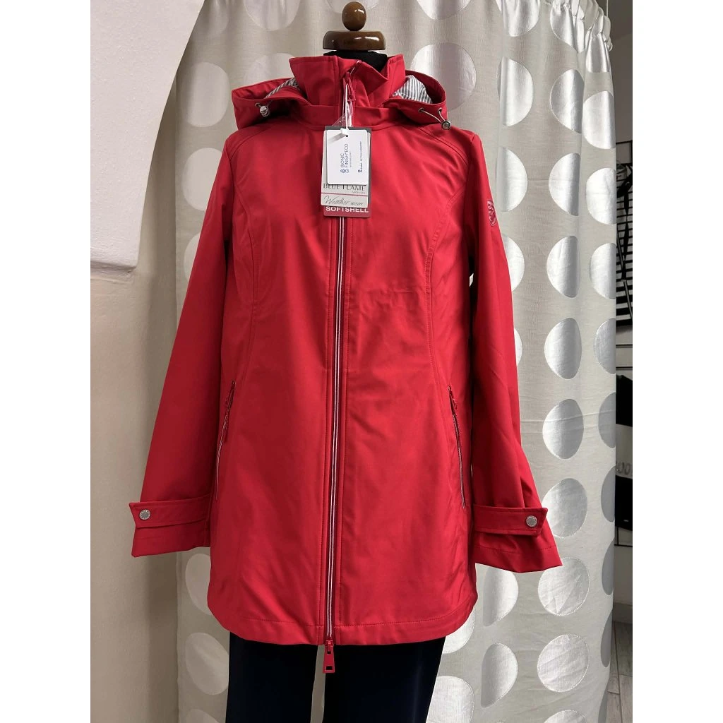 Bunda jarní červená s odjímatelnou kapucí s proužkem, rovný střih, kapsy zadělány patkami, zip hlavní nepropustný zip
