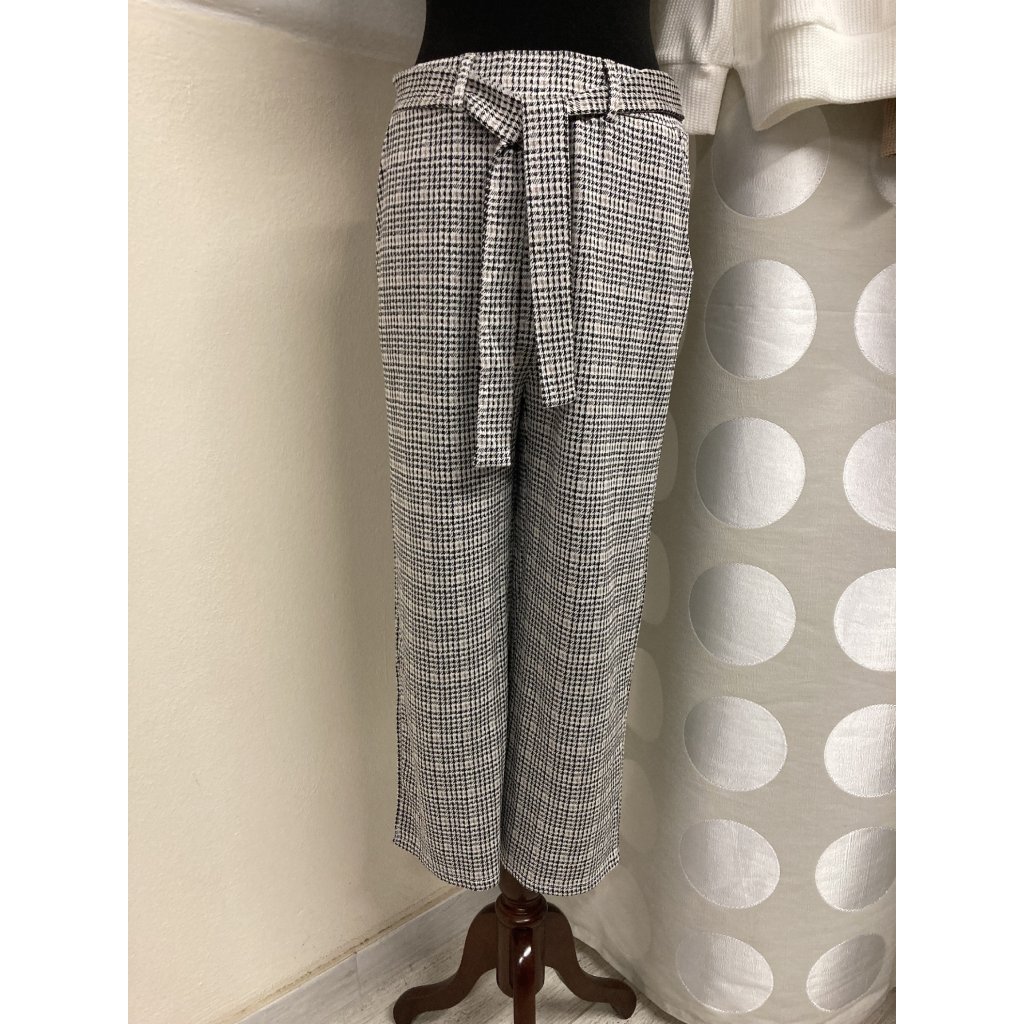 Kalhoty 7/8 široké káro s puky, do pevného pásku s ozdobnou mašlí místo pásku, velmi příjemný úplet
